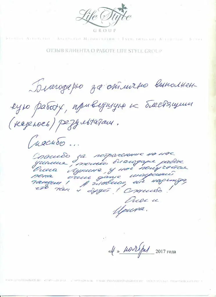 "Если Вы еще одиноки и мечтаете найти свою вторую половинку и быть такими же счастливыми как мы, то обращайтесь в компанию Life Style Group, где работают настоящие профессионалы, которые помогут Вам обрести свое счастье!"