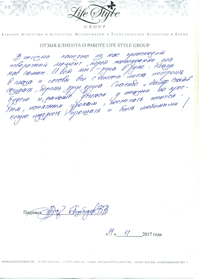 Life Style Group – современная компания свадебной индустрии, отличающаяся от существующих служб знакомств и брачных агентств, собственными эффективными методиками и технологиями, созданными на основе российского и международного опыта в области семейной психологии и коучинга, детальным анализом запросов каждого Клиента и современного рынка услуг, регулярным контролем качества и динамичностью, а также строгой приверженностью к высокими стандартам сервиса, которые позволяют нам быть впереди и превосходить ожидания Клиентов!